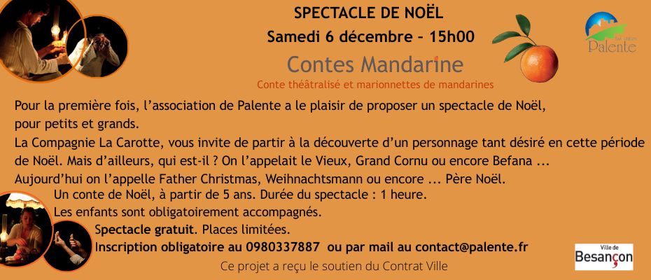 - Spectacle de Noêl : Contes Mandarines par la Compagnie La Carotte à partir de 3 ans. Pour vous inscrire, cliquez ici