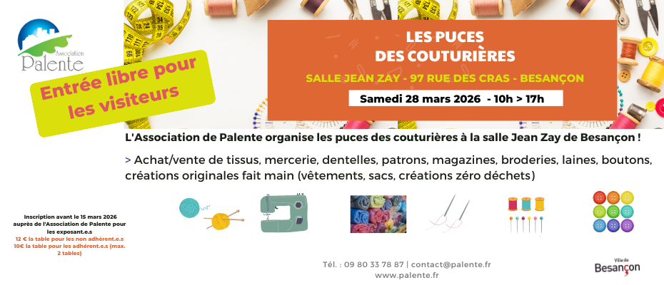 - SAMEDI 28 MARS : PUCES DES COUTURIERES (salle Jean Zay, de 10h à 17h). Entrée libre