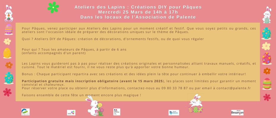 - MERCREDI 25 MARS : ATELIER DES LAPINS, spécial "PAQUES" (DIY). Adultes et enfants accompagnées. De 14h à 18h