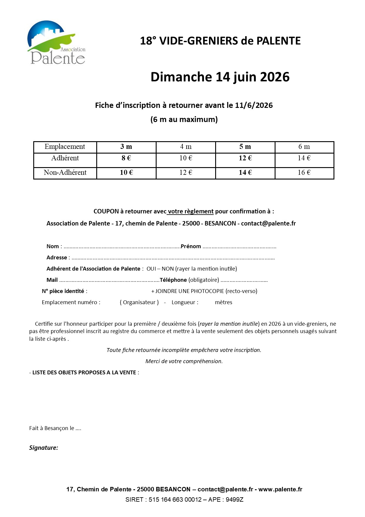 Les stands seront attribués dans l’ordre des inscriptions.